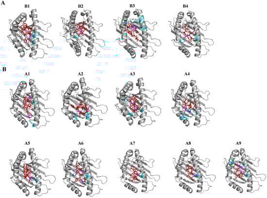 Molecular docking analysis of SARS-CoV-2 peptides (shown as red) to human HLA-B7 (A) and HLA-A*01:01 (B) protein (shown as gray). The interacting residues of peptides are shown as magenta and the HLA-B7 and HLA-A*01:01 interacting residues are shown as cyan. B1 to B4 and A1 to A9 correspond to the peptide with information provided in Table 4.
