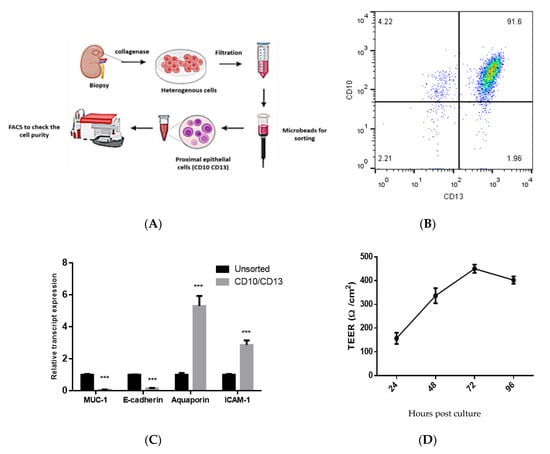 Isolation and characterization of primary human proximal tubular (PT) epithelial cells. (A) Schematic flow showing the isolation of PT epithelial cells from a kidney biopsy, and sorting of the cells using microbeads to isolate CD10+/CD13+ cells. (B) The isolated human PT cells were analyzed by flow cytometry to check for purity and the isolated cells were stained with anti-CD10 and anti-CD13. (C) The isolated human PT cells were checked for MUC-1, E-cadherin, Aquaporin1, and ICAM-1 mRNA expression by qPCR. Black columns represent unsorted cells, and grey columns represent CD10+/CD13+ cells. Depicted are the mean values of three independent experiments ± SEM. *** indicates p < 0.001 as determined by student’s t-test. (D) Transepithelial electrical resistance (TEER) was measured in the cultured CD10+/CD13+ PT cells over time.