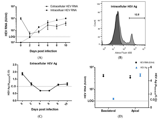 The PT cells were cultured on a transwell, and the polarized epithelial cells were infected with HEV-1 inoculum at the basolateral side. HEV RNA started to be increased in Day 2 (intracellular) and Day 4 (extracellular) postinfection (pi) and the viral load increased over time, reaching 1.1 × 104 and 5.4 × 103 at Day 10 pi for intracellular and extracellular HEV RNA, respectively (Figure 2A). Intracellular HEV capsid protein was detected in the infected PT cells at Day 10 pi by flow cytometry, and the percentage of HEV-ORF-2 positive cells was 13–20% (Figure 2B). The HEV ORF2 Ag was also accumulated extracellularly in the supernatants of HEV-infected cells over time; the level of HEV Ag was increased in both compartments (i.e., basal and apical side; Figure 2C). The HEV viral load was comparable in the basolateral and apical sides, while the level of HEV Ag was higher in the apical side compared to the basolateral side (Figure 2D).