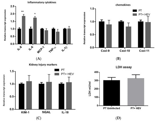We assessed the effect of HEV infection of the transcriptome of PT cells for selected inflammatory cytokines, chemokines, and kidney injury markers. Regarding the inflammatory markers, we found that HEV infection slightly upregulated IL-8 and IL-6 (fold change around 1.8 to 2 compared to uninfected cells; Figure 3A), but it did not affect the expression of other inflammatory transcripts such as monocyte chemoattractant protein-1 (MCP-1), tumor necrosis factor-alpha (TNF-α), and Interleukin 1 beta (IL-1β) (Figure 3A). The expression of type I IFN (IFN-α and IFN-β) was not altered with HEV infection. While HEV infection did not alter the transcription of chemokines such as Cxcl-9, Cxcl-10, and Cxcl-11 nor the kidney injury markers such as KIM-1, NGAL, and IL-18 (Figure 3B,C). There was no significant difference in the LDH level between the supernatant collected from HEV-infected and noninfected PT cells (Figure 3D).