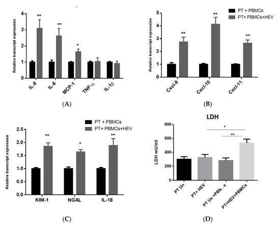 Then, we asked if PBMCs can affect the inflammatory response and kidney injury markers released from the PT epithelial cells upon HEV infection. To assess this point, we cocultured the PT epithelial cells challenged or not with HEV, with PBMCs collected from the same donors from whom the PT epithelial cells were isolated. Control samples, in which the coculture of PT and PBMCs was not challenged with HEV, were included. First, we analyzed the effect of PBMCs on the expression of the inflammatory and kidney injury markers released from the PT cells in the absence of HEV infection. We did not notice a significant difference in the transcription of these markers. Compared to uninfected PT epithelial cells/PBMCs coculture, we found that the inflammatory cytokines such as IL-8, IL-6, and MCP-1 were significantly upregulated in the PT/PBMCs cocultured cells challenged with HEV (Figure 4A). Additionally, we detected an upregulation in the transcription of chemokines such as Cxcl-9, Cxcl-10, and Cxcl-11 and kidney injury markers such as KIM-1, NGAL, and IL-18 markers suggesting the start of kidney injury (Figure 4B,C). PT and/or PBMCS challenged with UV-inactivated HEV-1 did not show signs of active HEV replication (Figure S1). PT epithelial cells/PBMCs coculture were challenged with UV-inactivated HEV-1, and we did not record a significant change in the transcripts of the inflammatory cytokines, chemokines nor AKI markers (Figure S2). The level of LDH was significantly higher in HEV-infected PT cells cocultured with PBMCs compared to HEV-infected PT cells without PBMCs (Figure 4D).