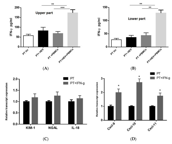 Since the release of the chemokines from the PT cells and the degree of kidney injury are IFN-γ dependable [39,40,41], we assessed the level of IFN-γ produced from PT cells infected with HEV in the presence and absence of PBMCs. There was no significant difference in the level of IFN-γ produced from PT cells alone or PT cocultured with PBMCs in the absence of HEV infection. Additionally, the infection of the PT cells with HEV did not result in a significant release of IFN-γ in absence of PBMCs. In contrast, the coculture of PBMCs with HEV-infected PT cells led to a significant induction of IFN-γ in both apical and basolateral compartment (Figure 5A,B). To assess the direct effect of IFN-γ on the kidney injury, and chemokines stimulation, we treated PT cells with IFN-γ (1 ng/mL) for three days and then we assessed the effect of IFN-γ on the transcript level. Compared to PT cells alone, we found that IFN-γ upregulated the chemokines transcript (Cxcl-9, Cxcl-10, Cxcl-11) without effect on the transcript levels of kidney injury markers (KIM-1, NGAL, and IL-18; Figure 5C,D).