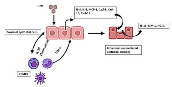 Collectively, our results suggested that the crosstalk between PBMCs and PT epithelial cells during HEV infection and the signals axes IFN-γ/chemokines and IFN-γ/IL-18 and KIM-1 could be the mechanisms mediated by HEV during renal disorders (Figure 6). Likewise, high levels of IL-18 and IFN-γ were detected in chronically inflamed tissue in chronic granulomatous disease [41].