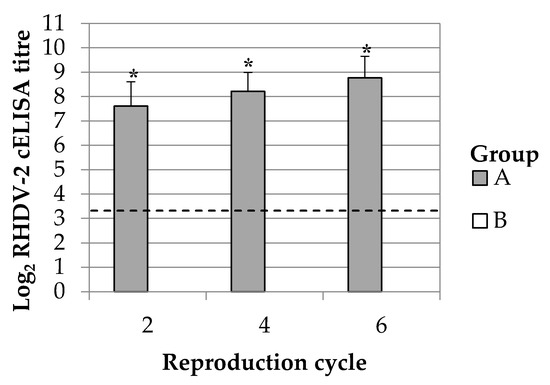 RHDV-2 antibody response in breeding does. Results are represented as average and standard deviation. Breeding does were vaccinated either with ERAVAC® (Group A) or inoculated with PBS (Group B). The slashed line indicates the cut-off of the assay (3.32 Log2 cELISA titre). Asterisks (*) indicate statistically significant differences between groups (Mann-Whitney U test, p < 0.05).