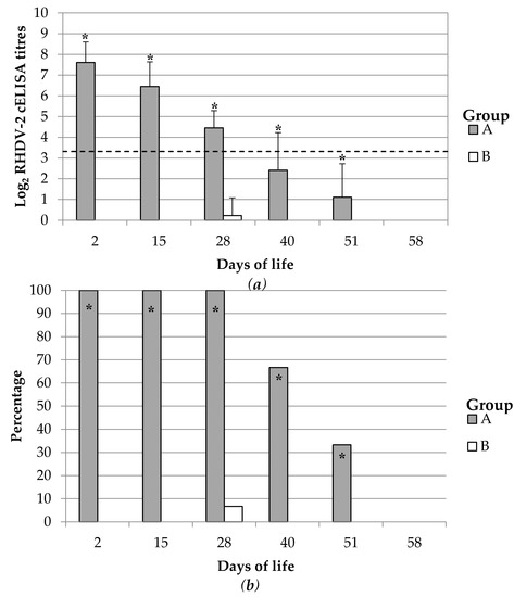 Duration of the maternal antibody immunity against RHDV-2 in rabbit kittens. Results are represented as (a) average and standard deviation of Log2 cELISA titres and (b) as percentage of positive rabbits. Rabbit kittens were born from breeding does vaccinated with either ERAVAC® (Group A) or inoculated with PBS (Group B). The slashed line indicates the cut-off of the assay (3.32 Log2 cELISA titre). Asterisks (*) indicate statistically significant differences between groups ((a) Mann-Whitney U test, p < 0.05; (b) Chi-square or Fisher test, p < 0.05).