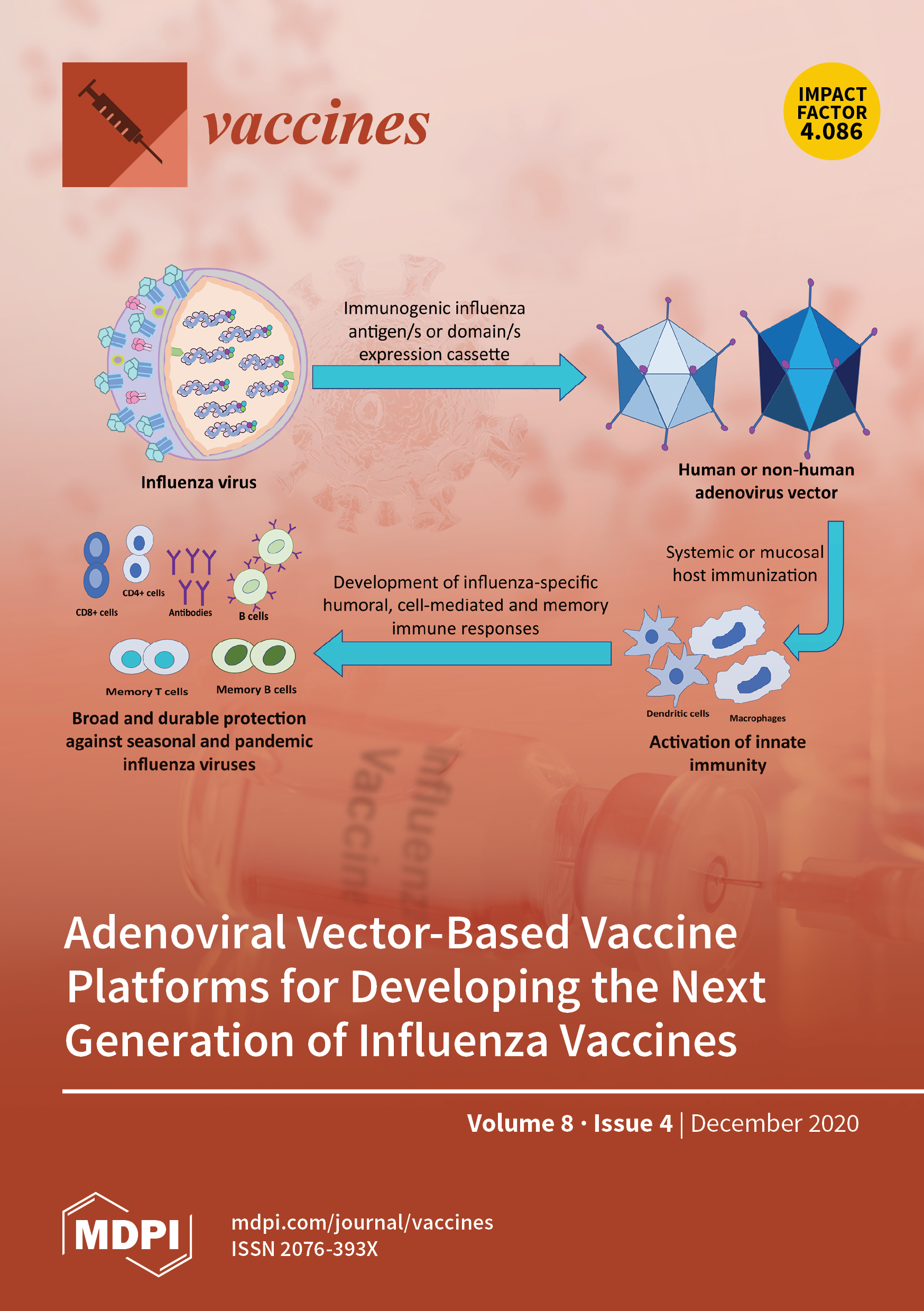 Cover Story: A human or nonhuman adenoviral (Ad) vector-based vaccine platform is a versatile egg-independent and cost-effective approach for generating large numbers of influenza vaccine doses in a short timeframe. The activation of innate immunity by the Ad vector induces broad, durable, and protective influenza-specific humoral and cell-mediated immune responses. Due to the availability of less-prevalent human Ad vectors and nonhuman Ad vectors as vaccine platforms, there will be a minimal impact of preexisting Ad vector immunity on vaccine efficacy. An Ad vector-based vaccine platform is well suited for designing effective vaccines not only for seasonal and pandemic influenza but also for other infectious diseases. View this paper.