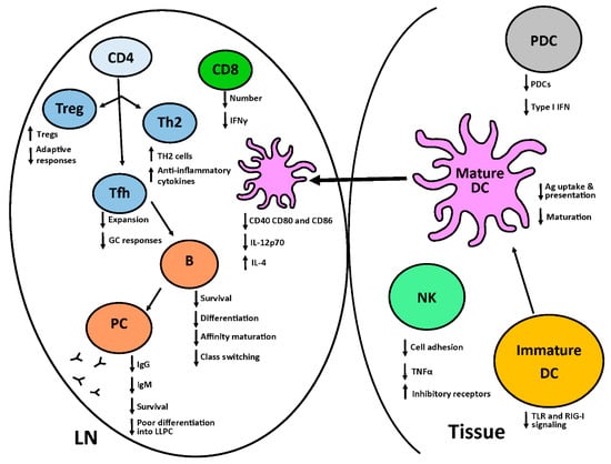 The neonate immune system has alterations that span both the innate and adaptive arms, both of which are important in viral clearance. Within the innate arm, NK cells have functional deficiencies that include decreased cell adhesion due to a reduction in selectins, reduced TNFα production, and increased inhibitory receptors. The number of neonatal PDCs is reduced as well as the amount of type I IFN produced from these cells. Potent adaptive immune responses are dependent on the capacity of DCs to undergo maturation together with the robust activation, differentiation and survival of T and B cells. DCs from newborns are challenged in this process, as they have decreased capacity to respond to PAMPs through TLR and RIG-I receptors resulting in impaired costimulatory molecules (CD40, CD80 and CD86) expression as well as diminished IL-12p70 production that is essential for the differentiation of CD4 TH1 cells and CD8+ T cells. There is also increased IL-4 production from newborn DCs. The low levels of IL-12p70 accompanied by increased IL-4 production skews the differentiation of CD4+ T cell towards TH2 cells. Decreased IL-12p70 impacts the CD8+ T cell differentiation leading to decreased production of IFNγ. Neonates also have heightened Treg responses. There are functional defects in neonatal Tfh cells including limited expansion leading to poor GC responses and reduced production of high affinity, isotype switched Ab.