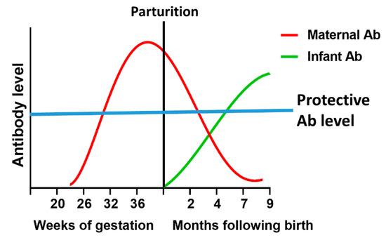 Because of the naïve status and challenges associated with the immune system of neonates, they rely heavily on maternal antibody for protection [163,164]. The maternal antibody concentration present at birth and the kinetics of decay are important factors that dictate how long these antibodies can provide protection in newborns [165,166]. The concentration of IgG transferred increases sharply during the third trimester [167,168,169] and thus, premature infants have significantly lower levels of maternal IgG than full-term infants [170]. While there is strong evidence that maternal antibody can provide protection [164], not all pregnant women have a high enough antibody response to protect infants from a given pathogen. The strategy to overcome this is to boost antibody levels by vaccination during pregnancy. At present, the World Health Organization (WHO) recommends maternal vaccination for tetanus, pertussis, and influenza [171]. It is crucial that women be vaccinated at a time that allows generation of a peak antibody response and thus optimal transfer of antibody to the infant. In a study by Englund et al., maximum transfer of antibodies to infants born to mothers who received the Haemophilus influenza type B conjugate vaccine occurred when the vaccine was administered at least one month before birth [172].
