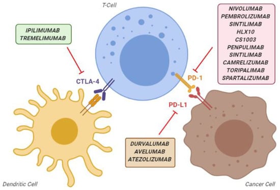 The presence of tumour-infiltrating lymphocytes expressing programmed death protein-1 (PD-1) in HCC mass and their correlation with outcome suggested that immunotherapeutic approaches could play a protective role against the progression of this cancer [,], as reported for other tumours [,]. Immune checkpoints are a normal part of the immune system. Their role is to prevent hyperimmune responses leading to tissue damage. The most known immune checkpoint are PD-1 and Cytotoxic T-lymphocyte-associated protein 4 (CTLA-4). In the oncological setting, pathological activation of PD-1 by its ligands, in particular ligand 1 (PD-L1), can result in the immune escape of the cancer cells. Thus, preventing the activation of the PD-1 receptor can restore the ability of immune cells to recognise and kill tumour cells [,]. On the other hand, CTLA-4 is mainly expressed on T cells and regulates the proliferation of activated lymphocytes. In physiological conditions, CTLA-4 regulates the end of the T-cell activity and prevents an excess in T-cell responses. Instead, in pathological conditions, it inhibits the activation, proliferation and production of tumour antigen-activated T cells in the tumour microenvironment (TME) [,]. Over time, many different PD-1, PD-L1, and CTLA-4 inhibitor agents have been developed that, collectively, are known as “immune checkpoint inhibitors” (ICIs) (Figure 1).