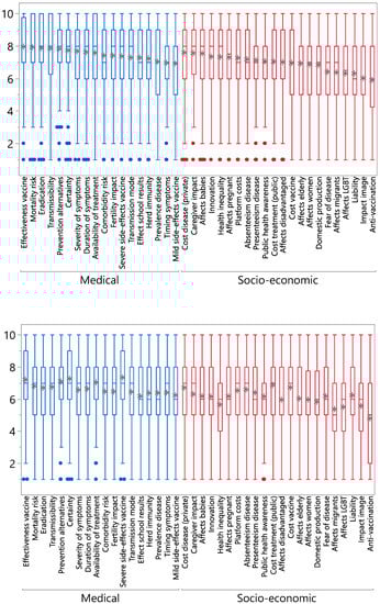 Three overall observations can be made. First, none of the 40 dimensions was dismissed as completely irrelevant by our sample, i.e., obtaining an average score below 5 in both positive and negative framings. The average of the positive items ranged from 5.9 (for the anti-vaccination proposition) to 7.9 (for the mortality proposition). The average of the negative items ranged from 4.8 (for the anti-vaccination proposition) to 7.3 (for the severe side-effects proposition). Only the negatively phrased anti-vaccination proposition had an average relevance score below 5. This indicates that our sample considers a broad range of criteria relevant to evaluate vaccines. Table 3 presents a ranking of the average scores of all statements in their positive and negative variants and connects them by means of letters. Statements with the same letter indicate that the average scores’ 95% confidence intervals overlap. This means that these average scores do not significantly differ from each other at the 5% level. The most relevant aspects were vaccine effectiveness, mortality risk, eradication potential, transmissibility, prevention alternatives, scientific certainty, severity of symptoms, duration of symptoms, cost disease (private), availability of treatment, caregiver impact, severe side-effects of the vaccine and whether the disease affects babies. The least relevant dimensions were whether the disease mainly affects migrants or LGBT members, legal liability for the state, impact on the country’s image and response by anti-vaccination groups.