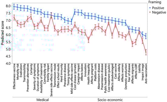 We constructed a general linear model to predict the respondent scores using item and framing (favourable and unfavourable) as categorical explanatory variables including the interaction between them. With an R-square of 95%, the model has a very high prediction power, where the predicted scores are the average scores from the boxplots in Figure 1. Figure 2 presents the predicted scores and their 95% confidence intervals. We clearly observe the relatively high scores of some socio-economic variables, such as caregiver impact and impact on babies. We also notice the systematically lower scores of the negative variants, except for a few items where scores overlap: risk of severe side-effects of the vaccine, treatment cost for the health system, vaccine cost, fear of the disease and legal liability.