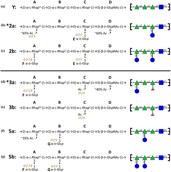 All serotypes in serogroup 3 contain O-acetylation on O-2 of rhamnose C (group O-factor 6) [13], which is important for antibody recognition [31,32]. Serotype 3a (Figure 1d) is defined by additional glucosylation on O-3 of rhamnose A (O-factor 7,8), with subtype 3a1 having partial O-acetylation on O-6 of GlcNAc D (O-factor 10, ≈40%); neither of which are present in serotype 3b (Figure 1e) [12,13]. Serotype 5a (Figure 1f) is defined by glucosylation at position O-3 of rhamnose B (type O-factor V) with subtype 5a1 having partial O-3-acetylation on rhamnose A (group O-factor 9, ≈35%) [13]. The most common 5a strain for laboratory study (M90T) has no O-acetylation [33,34]. Serotype 5b (Figure 1g) is glucosylated on O-3 of rhamnose A (O-factor 7,8) with no O-acetylation.