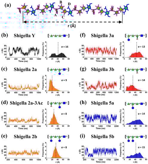Comparison of the r time series and corresponding histograms for 6 RU simulations of the modeled S. flexneri O-Ags. (a) A 6 RU model of the serotype Y O-Ag depicted with the end-to-end distance, r; rhamnose is colored pink and N-acetyl-glucosamine blue. The r time series (left column for each serotype) and corresponding distribution (right column for each serotype) are shown for (b) Y, (c) 2a, (d) O-3 acetylated 2a, (e) 2b, (f) 3a, (g) 3b, (h) 5a, and (i) 5b. The mean for each histogram distribution is depicted with a dashed line and the corresponding standard deviation is indicated.