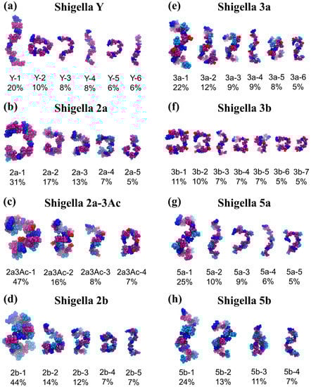 Figure 3 compares the conformational families for serotype Y (Figure 3a) and the serogroup 2 O-Ags (Figure 3b–d) with the serogroup 3 (Figure 3e,f) and serogroup 5 (Figure 3g,h) O-Ags. As discussed in prior work [26], the flexible Y backbone transitions between extended conformations (Figure 3a Y-1, Y-4, and Y-6) to more curved arrangements of the chain (Figure 3a Y-2, Y-3, and Y-5). Further, we showed that O-factor II (O-4 glucosylation at rhamnose C, serogroup 2) has a dramatic effect on the chain conformations, removing the extended conformations and restricting the O-Ag to a wide range of “C-curves” (Figure 3b). Additional substitution on O-3 of rhamnose A, whether O-acetylation in 2a (O-factor 9) or glucosylation in 2b (O-factor 7,8), was then shown to further restrict the chain and induce helical conformations (compare Figure 3c,d).