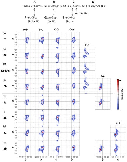 Conformational families of the central 4 RU of the 6 RU chains for (a) Y, (b) 2a, (c) O-3-acetylated 2a, (d) 2b, (e) 3a, (f) 3b, (g) 5a, and (h) 5b. Relative occupancies in the simulations (excluding the initial 200 ns) are indicated as percentages. Clusters of less than 5% are not shown. The sugars are colored: pink for Rha, dark-blue for GlcNAc, cyan for Glc side chains, and red for O-acetyl groups.