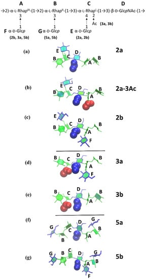 Fragments of the backbone showing the relative arrangements of the sidechains, the N-acetyl (blue) and the O-acetyl (red) substituents for serotypes (a) 2a, (b) 2a-3Ac, (c) 2b, (d) 3a, (e) 3b, (f) 5a, and (g) 5b. Glucose rings are colored blue, rhamnose green.
