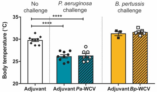 Challenge with P. aeruginosa, but not B. pertussis, reduces the body temperature of challenged animals, compared to adjuvant-vaccinated, non-challenged animals. Body temperatures were measured using infrared thermometer aimed at the abdominal region of the animal (n = 3–10). The asterisks and bars refer to statistical significance determined by ANOVA with multiple comparisons: **** p ≤ 0.001.