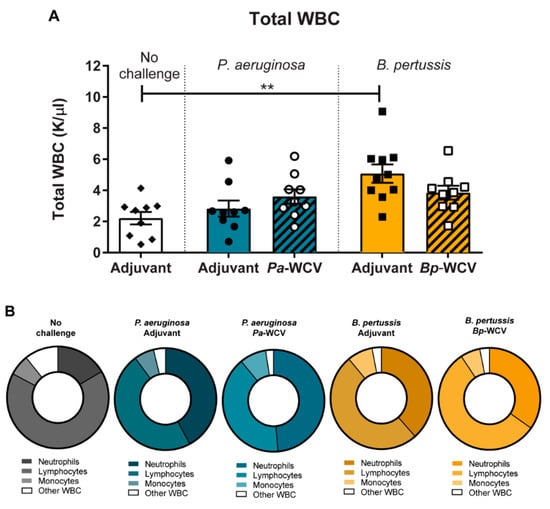 To fight infection, immune cells are mobilized from the bone marrow and circulate in the blood before reaching the site of infection []. This increase in circulating white blood cells (WBC), is sometimes severe enough to be termed leukocytosis. Specifically during B. pertussis infections, secreted pertussis toxin (PT) prevents innate immune cell chemotaxis to infected tissue, effectively trapping cells in the circulatory system []. Leukocytosis can lead to the development of pulmonary hypertension and respiratory failure, which are major causes of death for infants that contract the disease []. To examine the role of each pathogen and WCV on the mobilization of WBC after infection, we performed hematology on mice one day post-challenge. First, we observed that B. pertussis infection in adjuvant-vaccinated animals resulted in an overall increase in the number of WBCs (Figure 4A), corroborating the hallmark leukocytosis that occurs in infected humans []. We observed that this change was due in large to increases in circulating neutrophils (p = 0.0099) and lymphocyte populations in B. pertussis-infected mice, compared to non-challenged controls (Figure 4B). However, mice that had been administered Bp-WCV prior to challenge did not have significant leukocytosis (Figure 4A), nor significantly more neutrophils than non-challenged mice (Figure 4B). Leukocytosis is not typically used as a marker for disease severity during P. aeruginosa respiratory infection. We did not observe changes in the total number of WBC in the adjuvant-only vaccinated or the Pa-WCV P. aeruginosa infected mice (Figure 4A). There were, however, other observable shifts in the types of WBC present. Challenged groups had a higher proportion of circulating neutrophils, compared to adjuvant only vaccinated, and this was exacerbated in animals which had received the Pa-WCV (p = 0.0055). The opposite occurred in the B. pertussis groups: adjuvant vaccinated and pertussis challenged mice had higher levels of neutrophils (p = 0.009) in their blood compared to non-challenged. We also observed a reduction of leukocytosis in mice that received Bp-WCV, and the level of circulating WBC in these animals were similar to those of the non-challenged controls (p = 0.88) (Figure 4B).