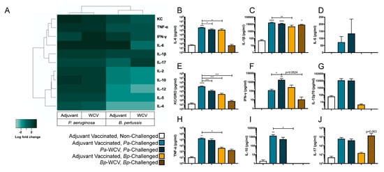 When examining cytokine changes during B. pertussis infection, we observed that the overall changes were less pronounced than those observed in the P. aeruginosa challenged groups (Figure 5A–J). Rather than inducing a cytokine storm-like response, B. pertussis infection, with or without immunization, caused a more specialized response. B. pertussis infection in adjuvant-vaccinated mice induced modest but non-significant increases in IL-6, IL-1β, KC/GRO, IFN-γ, TNF-α, and IL-17, compared to non-challenged mice. However, in mice which had received Bp-WCV, we observed a significant increase in IL-1β in the Bp-WCV group compared to non-challenged mice. We observed a non-significant increase in IL-17 in mice which had received Bp-WCV prior to challenge, compared to those which had only received adjuvant (p = 0.063). A similar increase in IL-6 expression was observed in the adjuvant-only vaccinated, challenged group, but partially mediated by Bp-WCV, suggesting that IL-6 production is mainly triggered by infection with B. pertussis, consistent with previous findings []. In addition, levels of IL-6, KC/GRO, IFN-γ, IL-12, and TNF-α were slightly reduced in the Bp-WCV group compared to adjuvant-vaccinated B. pertussis challenged, indicating that vaccination helps decrease the production of pro-inflammatory cytokines upon challenge. Additionally, while P. aeruginosa challenge, regardless of the vaccine administered, was associated with a non-significant increase in IL-17, Bp-WCV, not infection, was associated with increased IL-17. Overall, the data obtained indicate that both pathogens trigger very distinct cytokine responses upon infection with the B. pertussis challenge associated with a Th1/17 response, while P. aeruginosa triggers a cytokine storm. In addition, only the Bp-WCV, and not the Pa-WCV seemed to alleviate the pro-inflammatory cytokine response associated with challenge.