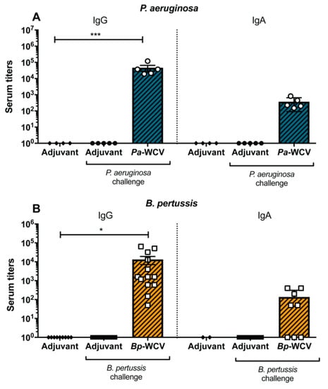 Taken together, these data illustrate the striking differences between infection- and vaccine-induced protection against the respiratory pathogens B. pertussis and P. aeruginosa. Infection by either of these pathogens without prior vaccination led to severe disease. Vaccination was associated with a significant decrease in bacterial burden in the airway for either pathogen and their respective vaccine, but the immune components correlated with this protection were unique. Typically, serum antibody titers are used as a correlate of protection in human studies []. In order to examine the immunoglobulins produced following vaccination and challenge, ELISA were performed to detect whole bacteria specific antibodies in the blood serum. In both Pa-WCV and Bp-WCV groups, we detected significant production of bacteria-specific IgG and IgA in the serum against the respective pathogens (Figure 7). These findings support that intranasal immunization can induce systemic immune responses to their respective pathogens.