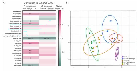 Measurement of correlates of protection. (A). Correlation of bacterial burden with measured immune components after challenge with B. pertussis or P. aeruginosa (n = 4 per group). The R2 and p values were calculated using linear regression analysis. A higher absolute value of R2 indicates that the factor was strongly correlated with the bacterial burden. Positive slope (pink) indicates that an increase in that factor was associated with higher bacterial loads, whereas a negative slope (green) shows that the increase in that factor was associated with reduced bacterial burden. Asterisks overlaying the heatmap indicate linear regression analysis result: * p ≤ 0.05, ** p ≤ 0.01, **** p ≤ 0.0001. (B). Principal component analysis of measured immune components, with experimental groups shown by color. Purple is adjuvant-vaccinated non-challenged, blue is adjuvant-vaccinated, B. pertussis challenged, red is Bp-WCV, green is adjuvant-vaccinated, P. aeruginosa challenged, and orange is Pa-WCV.