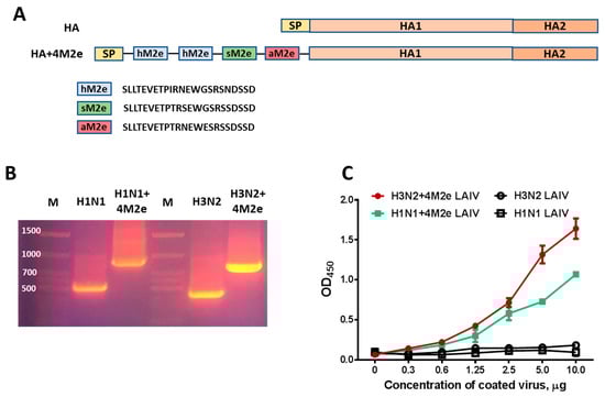 The chimeric HA+4M2e genes were then inserted into a dual-promoter plasmid vector for influenza reverse genetics (pCIPolISapIT). The recombinant LAIV+4M2e viruses, along with their matched control LAIV reassortants were generated on the A/Leningrad/134/17/57 (Len/17) backbone [25]. Vaccine viruses were rescued by electroporating Vero cells with the desired set of eight plasmids using Neon Transfection System, according to the manufacturer’s instructions (Invitrogen, Carlsbad, CA, USA). Rescued viruses were amplified in eggs at 33 °C and their full genomes were sequenced by Sanger sequencing to confirm their identities of inserted genes. For immunological assays, the classical H1N1 and H3N2 LAIV strains were amplified in eggs, concentrated on sucrose gradient and stored in aliquots at −70 °C, and 200 ng of purified viruses were coated per well of ELISA 96-well plates.