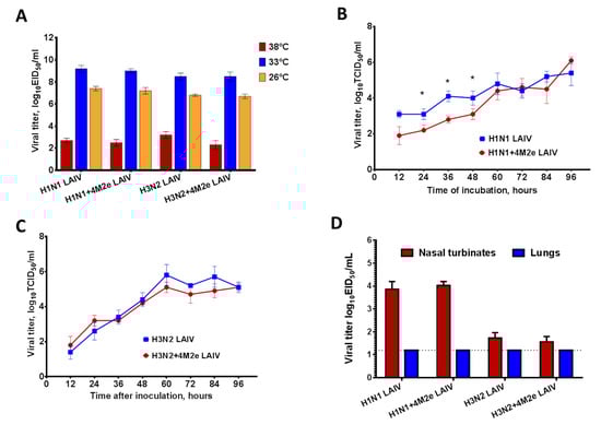 The 4M2e inserts did not have a negative impact on the growth kinetics of the H1N1 and H3N2 LAIV strains on MDCK cells. Although the H1N1+4M2e LAIV grew slower during the first 48 h than corresponding H1N1 LAIV, infectious titers of both H1N1 LAIVs became comparable at 60 h.p.i and increased up to 96 h.p.i. (Figure 2B). There was no difference at any timepoint for the infectious titers of the H3N2+4M2e and H3N2 LAIVs (Figure 2C). All LAIVs tested reached similar peak titers ~6.0 log10TCID50/mL.