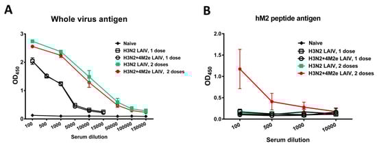 Serum IgG antibody responses to whole influenza virus antigen (A) and to human M2e peptide (B).