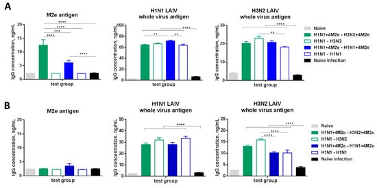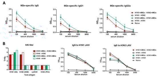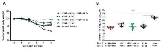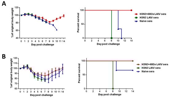 To determine whether the immune sera from mice immunized with the studied LAIV or LAIV+4M2e vaccine candidates would contribute to cross-protection against a different subtype of influenza A viruses, we carried out an in vivo protection assay as described in [27]. Briefly, sera from immunized or naïve mice were mixed with PBS at a 1:1 ratio and heat-inactivated at 56 °C for 1 h. Then the inactivated sera were mixed 1:1 with A/Philippines/2/82 (5 LD50) or A/Vietnam/1203/04-PR8 (5 LD50) virus and incubated at room temperature for 30 min. Groups of 5–6 naive BALB/c mice were infected intranasally with a mixture of virus and sera at a volume 50 µL and were monitored for their survival rates and weight loss as for two weeks.