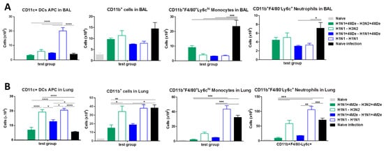 Innate immune cells are known to be recruited into the BAL fluids and lung due to inflammatory signals (e.g., cytokines) as a result of virus infection and are known to have both effects—inflammatory disease and generation of adaptive immunity in surviving hosts [31]. To understand the potential contribution of innate immune cells to protection or inflammation, we analyzed dendritic and innate immune cells in the airway BAL fluids and lungs in LAIV-vaccinated mice and naïve mice at day 5 after challenge infection with heterologous rgH5N1 virus (Figure 8). Flow cytometry data showed that CD11c+MHCII+ DCs and CD11b+ myeloid innate immune cells were recruited to the airway BAL fluids (Figure 8A) and lungs (Figure 8B) in LAIV-vaccinated mice, particularly in the homo prime boost H1N1 group at significantly higher levels than unvaccinated naïve mice after challenge infection. These results suggest that CD11c+ DCs recruited to the mucosal sites in LAIV-vaccinated mice might have contributed to inflammatory disease and generation of adaptive immunity in surviving hosts after challenge.