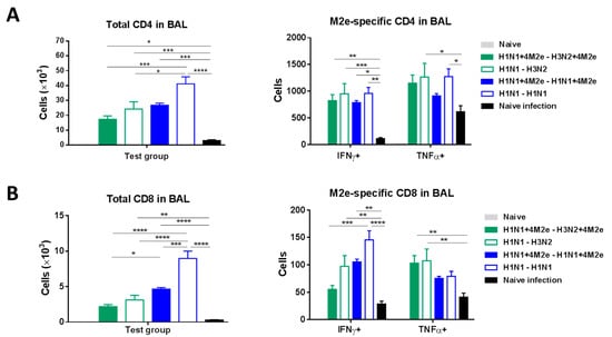 CD4 (A) and CD8 (B) T-cell responses in the airway BAL fluids of LAIV-vaccinated mice and naïve mice at day 5 after infection with heterologous rgH5N1 challenge virus. The left panel shows total number of cells in BAL. The right panel shows numbers of cytokine-producing cells after in vitro stimulation with human M2e peptide. Data were compared with one-way (left panel) or two-way (right panel) ANOVA followed by Tukey’s multiple comparisons test (* p < 0.05, ** p < 0.01, *** p < 0.001, **** p < 0.0001).