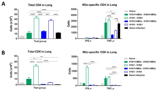 CD4 (A) and CD8 (B) T-cell responses in the lungs of LAIV-vaccinated mice and naïve mice at day 5 after infection with heterologous challenge virus. Left panel shows total number of cells in BAL. The right panel shows numbers of cytokine-producing cells after in vitro stimulation with human M2e peptide. Data were compared with one-way (left panel) or two-way (right panel) ANOVA followed by Tukey’s multiple comparisons test (* p < 0.05, ** p < 0.01, *** p < 0.001, **** p < 0.0001).