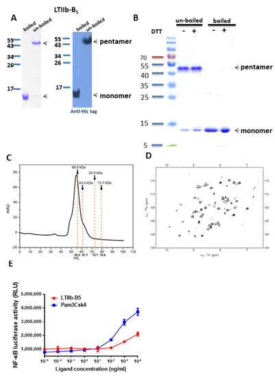 Recombinant LTIIb-B5 proteins have been shown to form native pentameric structures from monomers. According to our NMR evaluation data, recombinant LTIIb-B5 expressed a well-folded property due to the dispersive distribution of HSQC spectrum resonances. Only one set of resonances corresponding to pentamer formation was identified, and no LTIIb-B5 monomer or other oligomeric formations were detected, indicating stability in LTIIb-B5 pentamer structure. Monomers in the same pentamer complex expressed the same conformations. TLR-2/1 activity was also displayed after boiling (data not shown). Further investigation is needed to clarify molecular interactions between TLR2/1 and pentamer complexes.