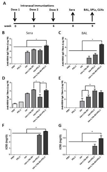 In the current study, the adjuvant effects of LTIIb-B5 show the increased IgG and IgA titers in sera and BALs, and higher numbers of IFN-γ and IL-17A secreting T cells in SPLs (Figure 5 and Figure 6). We incorporated the use of PELC oil-in-water emulsion with HA and LTIIb-B5 to facilitate the uptakes of antigen (HA) and adjuvant (LTIIb-B5) molecules targeting to the same antigen-presenting cells and their pattern recognition receptors for better antigen presentation regardless PELC has adjuvant properties. The combination of antigen (HA) and adjuvant (LTIIb-B5) proteins into single droplets of PELC oil-in-water micelles can be physically linked through the hydrophilic arms of PELC oil-in-water micelles attaching the soluble proteins of HA and LTIIb-B5 molecules. The combination of HA + LTIIb-B5 + PELC was found to achieve highest titers of neutralizing antibodies in sera and BAL fluids.