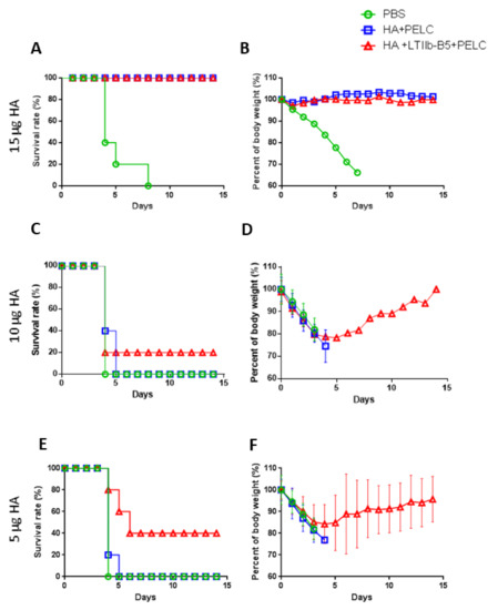 H5N1 viral challenges were performed following intranasal immunization. Mice (five mice per group, n = 5) were immunized with (A,B) 15 µg (C,D) 10 µg HA or (E,F) 5 µg HA. Three weeks after their third immunizations, all mice were given 10 × LD50 of the H5N1 virus (NIBRG-14), also intranasally. Survival rates and body weights were recorded daily for 14 days: blue line, HA + PELC; red line, HA + LTIIb-B5 + PELC; green line, PBS. Body weight loss >25% served as an end-point. Data presented as mean ± S.D.