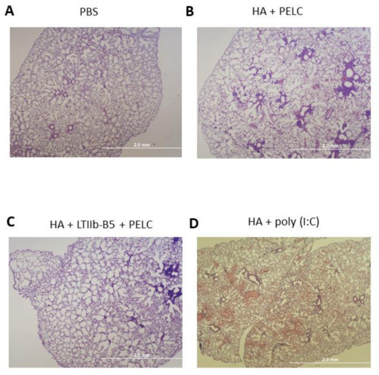 Representative photographs of lung tissue sections (×40 magnification). Mice (five mice per group, n = 5) were intranasally vaccinated with (A) PBS, (B) 5 μg HA + PELC, (C) 5 μg HA + 1 μg LTIIb-B5 + PELC, or (D) 5 μg HA +2 μg Poly (I:C). One week after final vaccination, the mice were sacrificed and lung tissue sections collected from mice were stained (H&E) for histopathological examination.