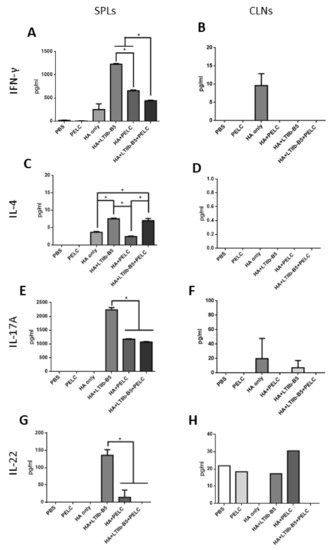SPLs and CLNs were collected at week 9 and stimulated with pooled HA peptides. ELISAs were performed to determine IFN-γ, IL-4, IL-17A, and IL-22 cytokine levels in culture supernatants. Results indicate that the use of LTIIb-B5 in adjuvant formulation enhanced IFN-γ, IL-4, IL-17A and IL-22 cytokine production in SPLs (Figure 5A,C,E,G). However, these cytokine levels in SPLs were reduced in the presence of PELC oil-in-water formulation (Figure 5A,C,E,G). The levels of IFN-γ, IL-4 and IL-17A cytokine production in CLNs were almost undetectable across all immunized groups (Figure 5B,D,F). The level of IL-22 cytokine production in CLNs for the HA + PELC immunization group was relatively higher than other immunized groups (Figure 5H).