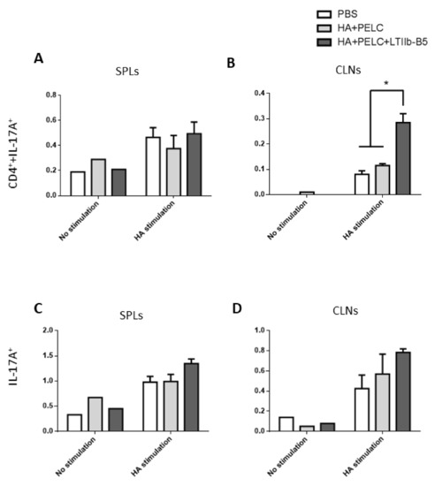Flow cytometry data show the increase of CD4+IL-17+ and IL-17+ T cells in SPLs and CLNs with stimulation of pooled HA peptides (Figure 6A–D). In particularly, the percentage of CD4+IL-17+ CLNs in the HA + PELC + LTIIb-B5 group was significantly higher than the HA + PELC and PBS groups after stimulation of pooled HA peptides (Figure 6B). Thus, the use of LTIIb-B5 adjuvant for intranasal immunizations induced stronger Th17 cellular responses.