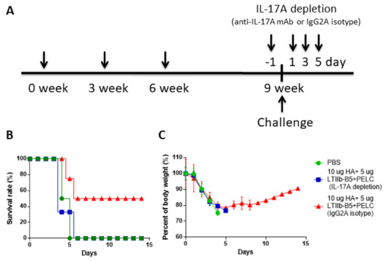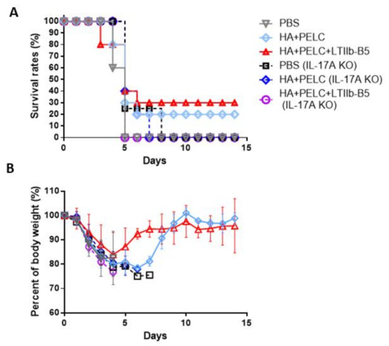 Groups of BALB/c mice, C57BL/6 mice, IL-17A knockout mice were intranasally immunized with three doses of recombinant HA without or with LTIIb-B5 adjuvant formulated in PELC oil-in-water emulsions or three doses of PBS as a mock control. Immunized mice were challenged intranasally with H5N1 NIBRG-14 virus (A/Vietnam/1194/2004) (H5N1) 3 weeks following the third dose immunizations at a 10-fold mouse median lethal dose. For IL-17A depletion, two groups of BALB/c mice immunized with 10 μg HA + 5 μg LTIIb-B5 + PELC were intraperitoneally injected with 0.1 mg of anti-IL-17A monoclonal antibody (mAb) (R&D SYSTEMS) or IgG2A isotype control mAb (R&D SYSTEMS) at 1 day before and 1, 3, 5 days after viral challenges. Survival rates and body weights were recorded daily for 14 days. Body weight loss >25% was used as an end-point.