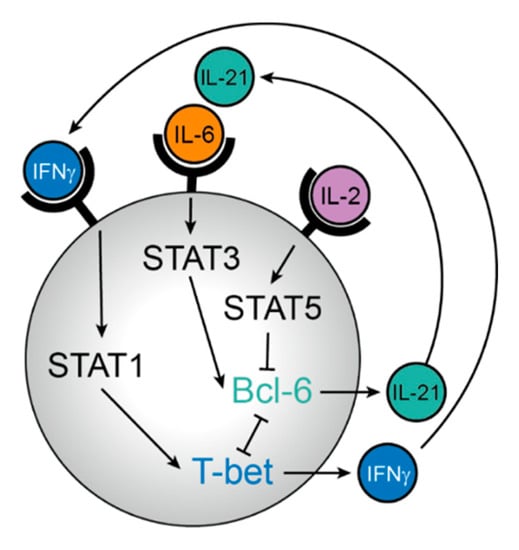 - Johnston, R.J.; Choi, Y.S.; Diamond, J.A.; Yang, J.A.; Crotty, S. STAT5 is a potent negative regulator of TFH cell differentiation. J. Exp. Med. 2012, 209, 243–250. [Google Scholar] [CrossRef] [Green Version]