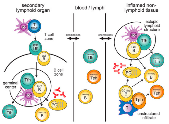 These Tfh-like cells, also recently termed peripheral T helper cells (Tph), have now been identified in a variety of inflamed non-lymphoid human tissues, such as the joints of rheumatoid arthritis patients [88], the skin in systemic sclerosis [90,91] and pemphigus [92], the kidney in lupus nephritis [89], intestinal tissue in celiac disease [91], nasal polyps [93], salivary glands in Sjögren’s syndrome [94,95], the lung of sarcoidosis patients [96] and peritumoral tissue of breast cancer patients [97]. Although their presence in inflamed non-lymphoid tissues is a key feature of Tph cells, similar to Tfh cells, they can also be found as a circulating memory population in the peripheral blood, which seems to reflect an ongoing immune response in the inflamed tissue [88,91,94,95,96].