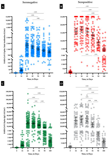 Considering each time point separately, anti-S titers of seropositive individuals were always statistically higher compared to seronegative individuals (p < 0.0001), except for IgG at day 180 time point (Table 1). The difference of titers between seronegative and seropositive individuals was higher when measuring total antibodies compared to IgG, but the difference tended to decrease over time (Table 1, Figure 1).