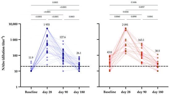 Neutralizing antibodies (NAbs) were assessed on a subset of 60 subjects at different time points (0, 28, 90 and 180 days) using a pseudo-virus neutralization test (pVNT) as described elsewhere [23,24]. For this latter assay, samples were considered negative if the half-maximal inhibitory concentration (IC50) value was below the dilution of 1/20.