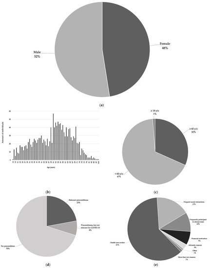 Concerning health status, 918 (36%) provided information, whereas 1623 (64%) did not. Further, 274 (11%) stated underlying medical preexisting conditions; of these, 203 (74%) individuals reported preconditions that constitute a high risk for a severe course of COVID-19. Finally, 644 (23%) of all individuals explicitly stated that they were healthy (Figure 2d).