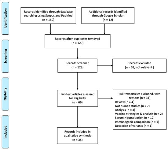 The review selection process according to the PRISMA guidelines is illustrated in Figure 2. A total of 192 articles were identified through database searching and 129 of them were screened after removing duplicates. In the screening process, 63 non-relevant articles, including discussions of vaccination strategies and non-variant articles, were removed after reviewing their titles and abstracts. Out of 66 articles accessed for full-text, 35 were included for the final study. A total of 12 (38.7%) of the excluded articles focused on serum neutralization effects on variants, 7 (22.6%) conducted non-human studies, and 8 (25.8%) were either review papers or analyses. A further four of the excluded articles discussed vaccine strategies, immunogenic comparison, and variant detection techniques.
