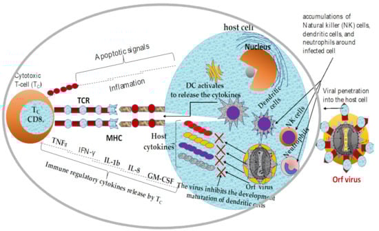 Orf virus invades a susceptible host and temporarily replicates in infected cells by subverting the reactivation of the immune response [102]. Once internalized, innate immune cells such as neutrophils, dendritic cells (DCs), [103] and natural killer cells (NKs) are constantly recruited to sites of infection to engulf the antigens and facilitate migration of the engulfed antigens to peripheral lymph nodes, where antigen presentation to newly recruited naive T cells [105] and memory cells occurs. The DCs present the viral antigen to the specialized cytotoxic CD8+ T cells of the immune system, resulting in the proliferation of granulocyte-macrophage colony-stimulating factor (GM-CSF), interleukin-1β (IL-1b), interferon-α (IFN-α), and IL-8 and IFN-γ. The virus can subvert the actions of the host immune response by secreting anti-inflammatory immunomodulatory proteins responsible for neutralizing the virus [106,107,108,122].