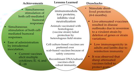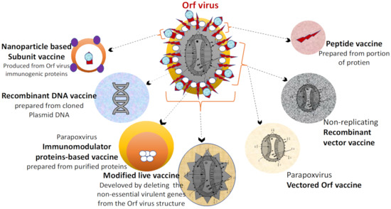 The historical events in vaccine developments didn’t just begin with the initial inoculation of human skin with the material collected from cowpox pustules by Edward Jenner to protect humans against smallpox [120,121,122,123,124,125,126,127,128,129,172,173]. Rather, it can be traced back to the history of infectious diseases of the human and veterinary importance [129]. Historically, ORFV vaccines containing tissue culture attenuated live virus or live scab-based virus preparations have been available since the late 1930s [25,86,129,159]. Parapoxvirus (ORFV) is currently used as attenuated live virus and/or as a vector for antigen delivery systems for other viral vaccines such as vectored rabies vaccines [25,78,128,174]. In spite of the abundant studies published, on both vaccine development ‘and immune response to ORFV infections, few vaccines against ORFV infection are licensed [56,174]. As of today, there are no universally approved sheep or goat vaccines against ORFV infections. Therefore, there is a need to develop a universal ORFV vaccine that could provide protection against worldwide strains of the virus [78,122,174]. However, the humoral, and T-cell analysis revealed that live-attenuated vaccines have shown several benefits. In addition, all the current licensed vaccines used to protect sheep and goats against ORFV infections are based upon live (scab-based) and live-attenuated (Figure 3). Currently, no subunit, peptides, or DNA vaccines are licensed, but some recent publications have demonstrated that chimeric DNA vaccines and recombinant vaccines against ORFV infection have shown promising results [126,129,175].