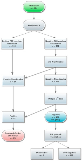 The NHR cohort was divided into two groups in order to assess the sensitization status (Figure 1). First was the previous COVID19 infection (PI) group, which included a total of 152 subjects, and 133 of them had positive PCRs before administration of the first vaccine dose. Five were PCR positive between the first and the second dose. In this group, we have also included 14 residents who presented detectable anti-N antibodies as a marker of prior infection.