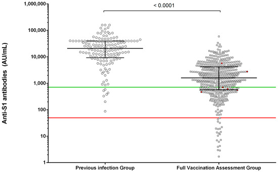 Comparison of anti-S1 antibody levels after two months of BNT162b2 full vaccination in nursing home residents (NHR). The anti-S1 antibody level in the previous infection group (white circles) and full vaccination assessment group (white squares) is depicted. The anti-S1 levels below the red line at 50 AU/mL indicates those NHR identified as seronegative after full vaccination. Whereas a value below 715 AU/mL of anti-S1 antibody level (green line) after two months of vaccination shows patients at risk of infection (red squares). The mean differences were assessed by Student’s t-test.