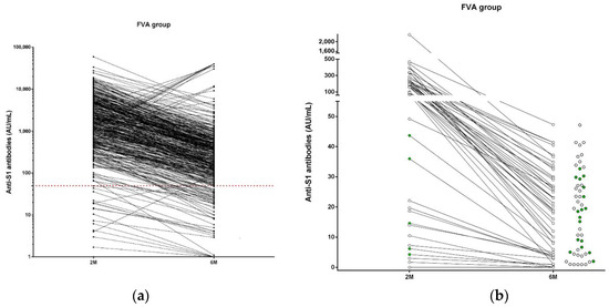 Comparison of anti-S1 antibody levels and cellular immunity after two and six months of BNT162b2 full vaccination in nursing home residents (NHR) included in Full Vaccination Assessment (FVA) group. The level of anti-S1 antibodies was compared in NHR at two and six months after full vaccination in the FVA group. The red line shows the anti-S1 levels at 50 AU/mL, subjects with anti-S1 values below this line were identified as seronegative (a). All seronegative NHR after six months of vaccination were assessed for cellular immunity; the green circles show positive specific cellular immunity whereas the white circles show those without a cellular-specific response to vaccination (b).
